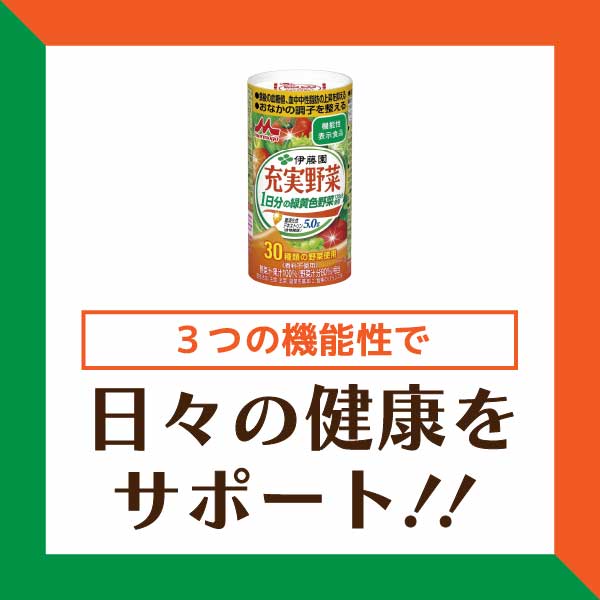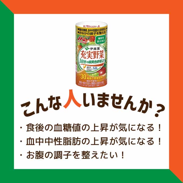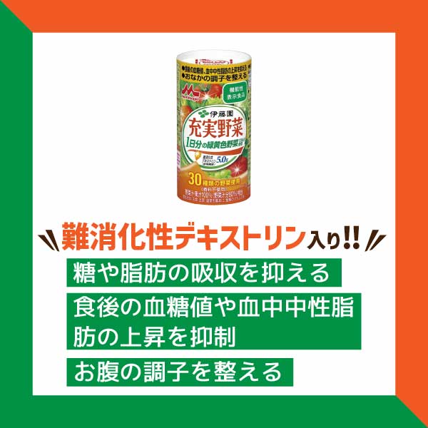 充実野菜は食後の血糖値、血中中性脂肪の上昇が気になる方、お腹の調子を整えたい方にお勧めの1本です。野菜汁・果汁100%!緑黄色野菜が120g摂れます。また、充実野菜に含まれる難消化性デキストリンは、糖や脂肪の吸収を抑え、食後の血糖値や血中中性脂肪の上昇を抑制すること、お腹の調子を整えることが報告されています。