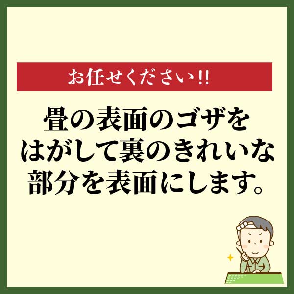 畳の表面のゴザをはがして裏のきれいな部分を表面にします。明治時代創業・4代目のプロが、あなたの畳の張替作業を1つ1つ丁寧に仕上げます。気になる事がございましたら、お気軽にご相談ください。