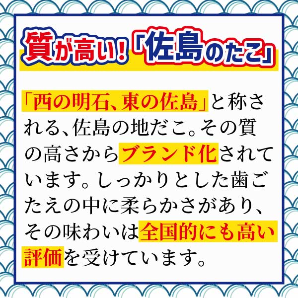 佐島のカニ・イセエビ・トコブシ・アワビをエサに育ったたこをたこ籠漁で獲り、船上で活〆して加工場にて釜茹でした釜あげ地だこです。築地市場では「西の明石・東の佐島」と高い評価を受けています。市場では高値で取引される佐島産の地だこを格安でお届け致します。