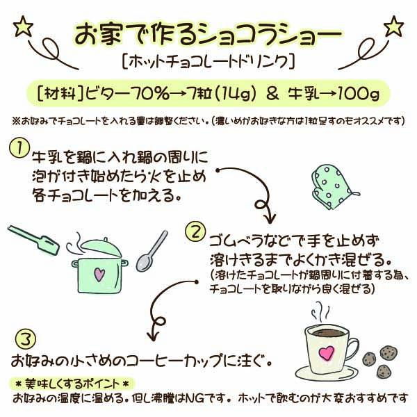 牛乳にチョコレートを溶かして飲む本格チョコレートドリンク・ショコラショーにしても美味しくいただけます。ショコラショーのレシピはチョコレートのパッケージ裏側に書いてあります!是非、そちらを参考に最高のショコラショーを味わってみてください。