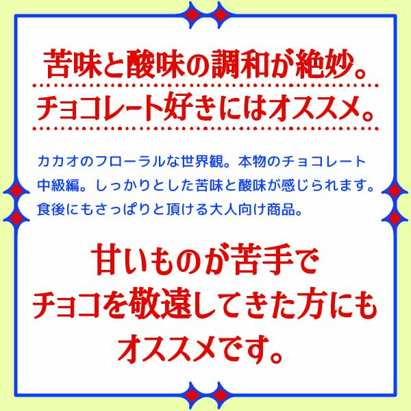 苦味と酸味の調和が絶妙。チョコレート好きにはオススメ。カカオのフローラルな世界観。本物のチョコレート中級編。しっかりとした苦味と酸味が感じられます。食後にもさっぱりと頂ける大人向け商品。甘いものが苦手でチョコを敬遠してきた方にもオススメです。
