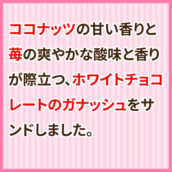 ココナッツの甘い香りと苺の爽やかな酸味と香りが際立つ、ホワイトチョコレートのガナッシュをサンド。