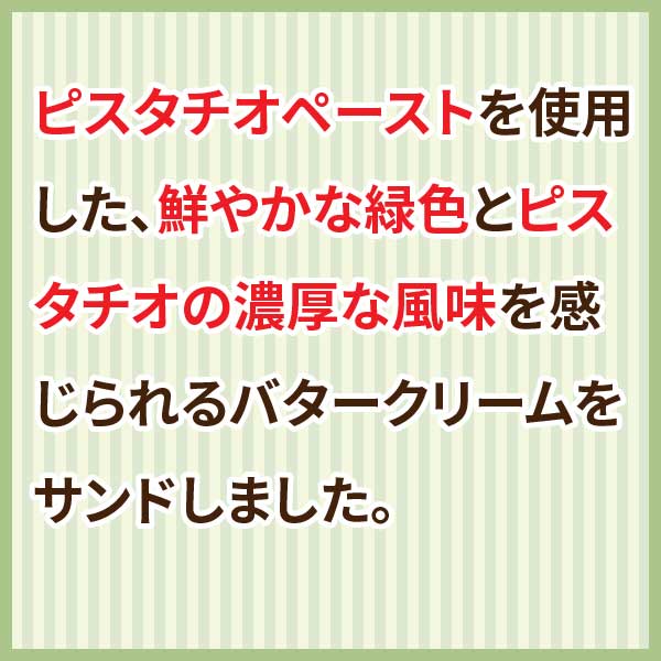 ピスタチオ味はピスタチオペーストを使用した、鮮やかな緑色とピスタチオの濃厚な風味を感じられるバタークリームをサンド。