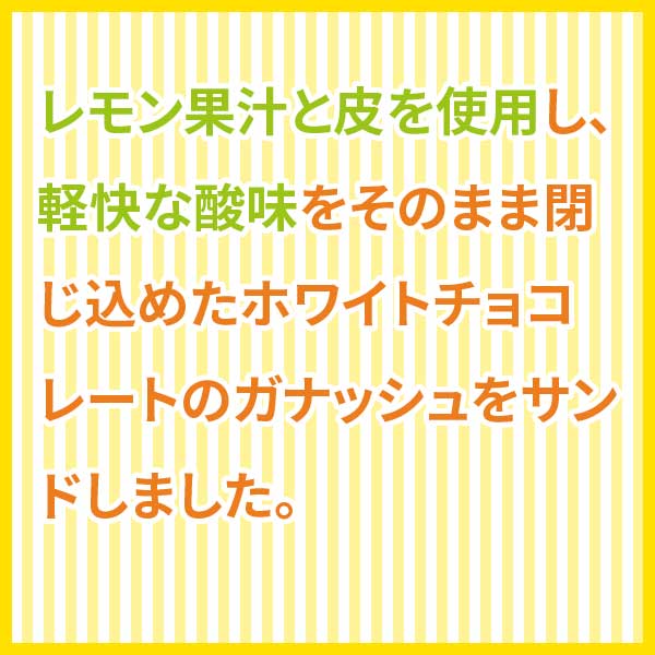 レモン果汁と皮を使用し、軽快な酸味をそのまま閉じ込めたホワイトチョコレートのガナッシュをサンド。