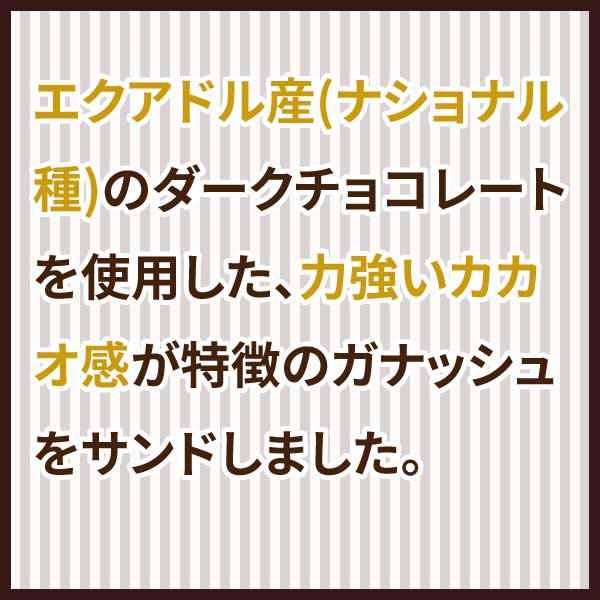 エクアドル産(ナショナル種)のダークチョコレートを使用した、力強いカカオ感が特徴のガナッシュをサンド。