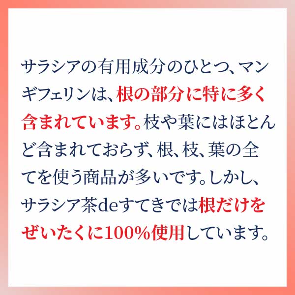 原材料のサラシアにこだわっています。サラシアの有用成分のひとつ「マンギフェリン」は、根の部分に特に多く含有されています。枝や葉にはほとんど含まれていません。サラシア茶deすてきのサラシアは根だけを100%使用。マンギフェリン含有量が5%以上のものの根の、先から3センチ以内だけを使用し、製品化しています。