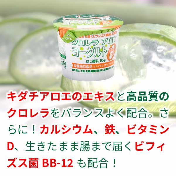 ノーベルのクロレラアロエヨーグルトはキダチアロエのエキスと高品質のクロレラをバランスよく配合しています。さらに!カルシウム、鉄、ビタミンD、生きたまま腸まで届くビフィズス菌BB-12も配合!クロレラアロエヨーグルト1つでいろんな栄養を摂ることができます。