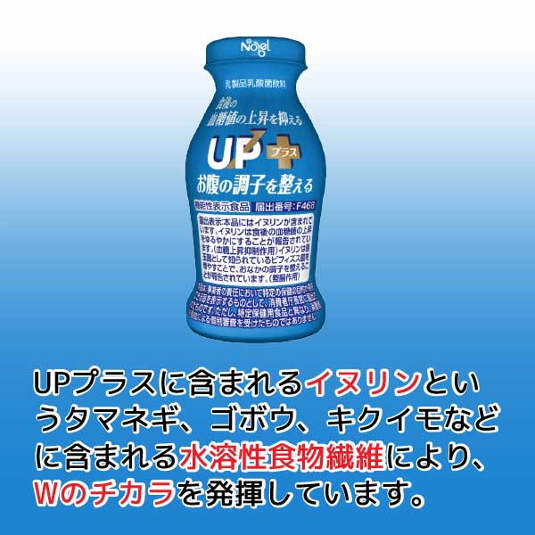 ノーベルのUPプラスはお腹の調子を整え、食後の血糖値上昇を抑える機能性表示食品です。UPプラスに含まれるイヌリンというタマネギ、ゴボウ、キクイモなどに含まれる水溶性食物繊維により、Wのチカラを発揮しています。
