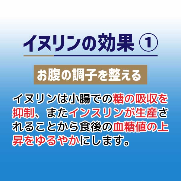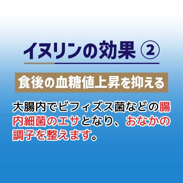 イヌリンは小腸での糖の吸収を抑制、またインスリンが生産されることから食後の血糖値の上昇をゆるやかにすることが報告されています。また、イヌリンは大腸内でビフィズス菌などの腸内細菌のエサとなり、おなかの調子を整えることが報告されています。